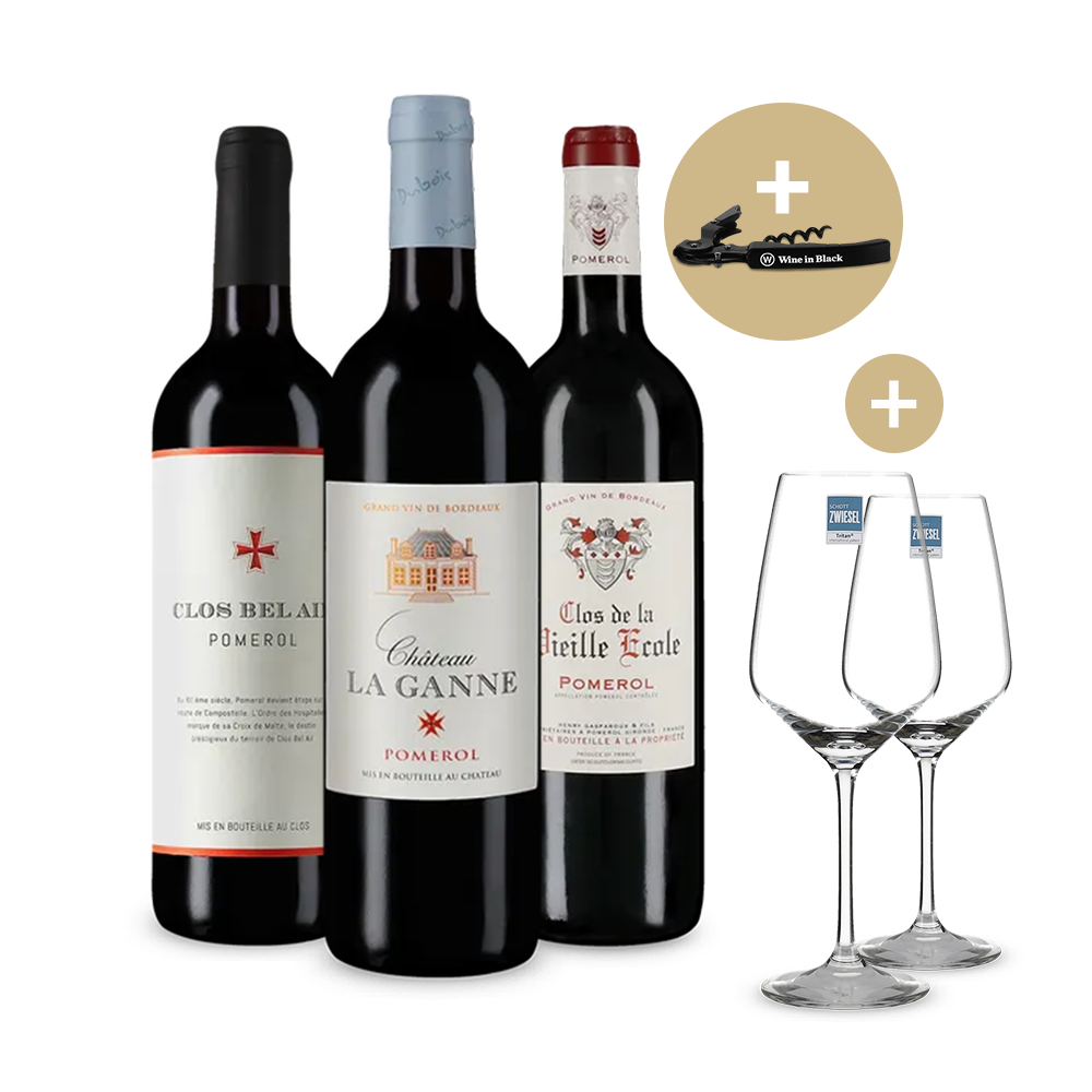 Pomerol deluxe im Set: 3 Flaschen, 2 Weingläser + Kellnermesser