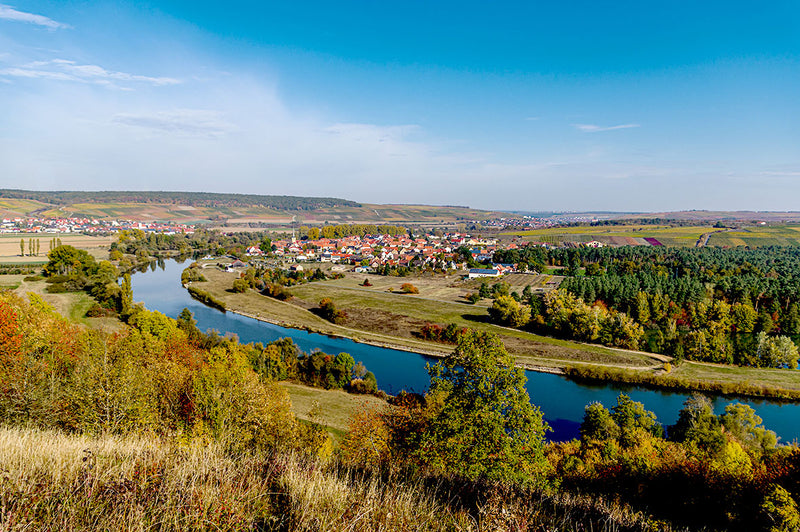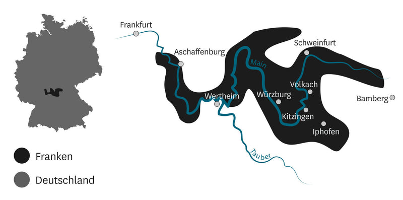 Das Maindreieck mit Würzburg in der Mitte ist das Zentrum des fränkischen Weinbaus. Hier dominiert Muschelkalk den Boden. Das Besondere: dieser Muschelkalk ist dem Kimmeridgium sehr ähnlich. Eine Bodenart, die man vor allem im Chablis im Burgund oder in Sancerre an der Loire findet. In den Top-Lagen wie dem Würzburger Stein oder dem Eschendorfer Lump wird meist Silvaner angebaut, der hier eine rassige Eleganz entwickelt und mit ausgeprägten Honignoten glänzt.Keuper im Steigerwald