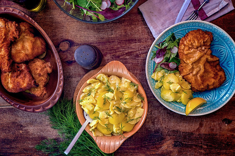 Beim Klassiker Kartoffelsalat mit Würstchen sind beide gleichberechtigte Partner. Probieren Sie dazu ruhig die milden Allrounder Silvaner und leichte Weiß- und Grauburgunder. Gibt es mehr dazu, entscheidet das dann, welcher Wein passt. Wird es deftiger, weil Röstaromen dabei sind, brauchen Sie auch im Glas einen kräftigen Partner. Zu Kartoffelsalat und Bratwurst können Sie auch einen leichten Roten nehmen, etwa einen Trollinger oder einen Pinot Noir, gern leicht gekühlt. Bier geht natürlich auch. Zu einem weiteren Klassiker - Kartoffelsalat mit Wiener Schnitzel - sind hingegen Weißweine von schöner Struktur und hoher Weinsäure wie Grüner Veltliner und Riesling gefragt. Denn die schneidet sich schön durch das Bratenfett und erfrischt.